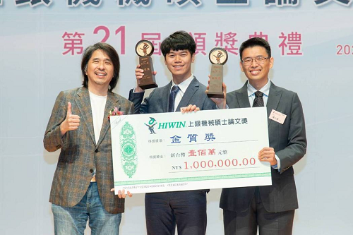 「上銀機械碩士論文獎」(Hiwin Thesis Award) 第21屆頒獎典禮於3月29日舉行,臺灣大學呂柏廷同學與楊士進教授以「印刷電路板繞組及冗餘位置感測器集成之軸向磁通馬達於衛星反應輪應用」勇奪金質獎、獎金100萬元。臺灣大學本屆推薦14篇論文參選,有8篇進入決審,最終有5篇獲獎,獎項囊括金質獎、銀質獎及佳作獎,堪稱本屆最大贏家。臺灣科技大學本屆推薦7篇論文參選,有4篇進入決審,4篇全部獲獎為第二贏家。