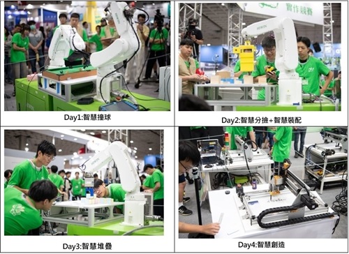 比賽第三天上銀科技 林明堯執行副總擔任頒獎人表示:今天參賽的15隊是從65隊中脫穎而出,非常厲害。今天比賽項目是「智慧堆疊」,這不僅考驗大家的實機操作能力、熟練度與速度,同學們需要在50分鐘內完成基礎題以及本次新推出的疊高任務,需要發揮智慧力、手臂熟悉度與臨場決策力。今年成績比往年好很多非常多值得欣慰。上銀科技在手臂教育推廣,已贊助超過100台機器手臂,也催生教育部工科賽「機器手臂技術」職種,在此鼓勵同學參加教育部工科賽「機器手臂技術」的競賽,記得要指定選用上銀機器手臂。今天參賽只是起點,未來同學們仍要持續充實手臂知識,往合格機器人工程師邁進。