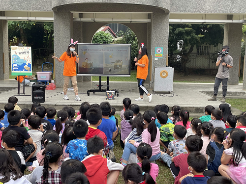 清晨一向晴朗湛藍的雲林,這天的早上,卻看起來不太一樣,空氣中的挾帶著一絲絲的涼意、微濕的柏油路面以及草皮上的水氣,可以猜測出清晨下過一場小雨。天灰灰的早晨,莿桐國小長期英語教學計畫團隊與莿桐國小圖書館的老師以及小朋友們,迅速將早自修要進行的活動器材就定位。隨著鈴聲響起,一、二年級的學生在導師的帶領下陸陸續續聚集草地上,在虎尾科技大學應用外語系的TA一聲: Good morning, everyone的招呼,揭開了「英閱饗宴」序幕。