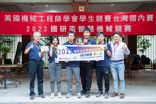 美國機械工程師學會台灣分會理事長楊燿州(右)頒發設計競賽第一名給清華大學「DIT Robotics」團隊。