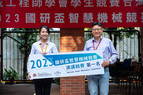 美國機械工程師學會台灣分會理事長楊燿州(右)頒發演講競賽第一名給清華大學趙喬萱。