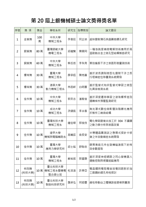 上銀機械碩士論文獎第20屆揭曉
