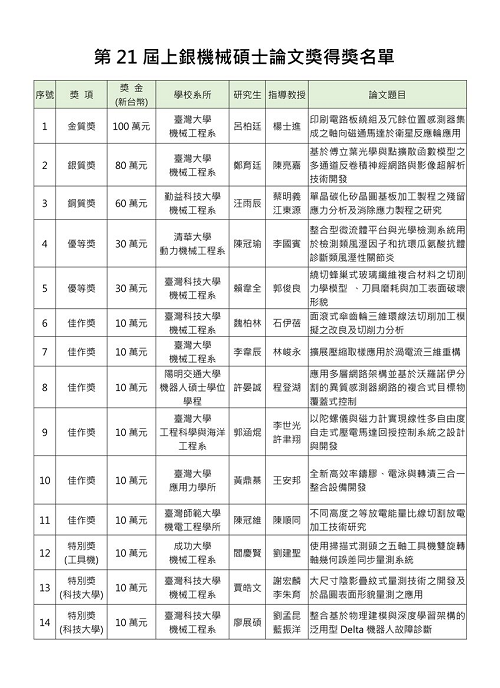 上銀每年投入1,000萬元經費,鼓勵大學研究所師生投入精密機械研究領域,第1~21屆參賽論文共2,018篇,得獎篇數314篇,得獎師生合計668人。二十一年來,上銀機械碩士論文獎陪伴機械系師生不斷精進,今年金質獎得主楊士進教授,曾獲第4屆工具機特別獎、第17屆佳作獎及第19屆銀質獎,第21屆終於拿下金質獎。第21屆頒獎人-國科會李旺龍處長,也是第6屆工具機特別獎得主。