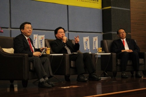 第一科大馮榮豐副校長(左一)、金可集團董事長蔡國洲(左二)、上銀科技董事長卓永財(右一),進行會後提問交流