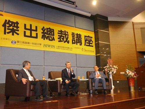 HIWIN傑出總裁講座」一年有兩次,新日興董事長(中)與第一科大校長陳振遠(左)、上銀科技公司董事長卓永財(右)跟現場學子交流。記者徐白櫻/攝影