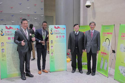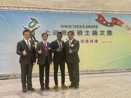 「上銀機械碩士論文獎」歷屆金質獎皆由頂尖國立大學獲得此殊榮,今年首次由技職體系的本校拿下,貝里斯籍摩根的論文以〈以振動訊號分析進行塑膠射出成型機性能監測之研究〉為題,經過嚴謹的審查程序,從全國的86篇論文中脫穎而出,一路過關斬將,勇奪佳績。國際副校長衞祖賞教授、指導老師周煥銘教授、朱孝業教授與家人和實驗室學生,以及摩根的家人與好友共同出席頒獎典禮,分享這份榮耀。