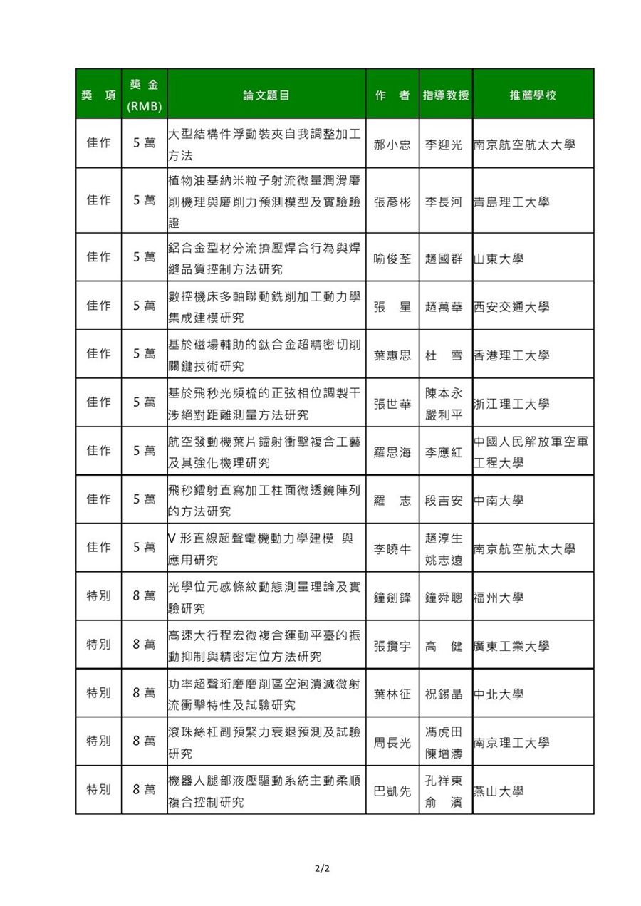 『上銀優秀機械博士論文獎』自2018年起新增設特別獎,特別獎的設置旨在獎勵非985高校在機械製造領域,特別是在機床或其基礎零部件,以及基礎製造工藝參賽論文,名額5篇,每篇獎金人民幣8萬元,第9屆因特別獎的增設起了很大的鼓勵效果,今年參賽論文高達162篇,較2018年成長23%。第9屆獲獎的27位博士及36位指導教授,經初審、複審、到終審總共經過3道關卡,終審還需進行口頭報告及答辯,兩天終審答辯過程,同學們緊張,評委們也辛苦與糾結,能得獎實屬不易,均為此領域的佼佼者;獲獎師生在得到榮譽的同時,透過得獎後的各種活動,展開了一系列專業交流,因而拓寬了視野,做研究向來是一條寂寞與反覆折磨的不歸路,得獎猶如十年寒窗無人問,一舉成名天下知,更堅定了他們在研究領域上不斷進取的決心。